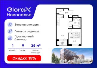 Продается 1-комн. квартира на 9-м этаже в строящемся проекте комфорт-класса GloraX Новоселье. Общая площадь лота составляет 35,68 кв. м, из которых 10,17 кв. м отведено под жилую и 14,13 кв. м под кухонную зону. Номер квартиры - 392