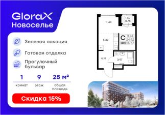 Продается квартира-студия на 9-м этаже в строящемся проекте комфорт-класса GloraX Новоселье. Общая площадь лота составляет 25,67 кв. м, из которых 11,44 кв. м отведено под жилую и 5,32 кв. м под кухонную зону. Номер квартиры - 383
