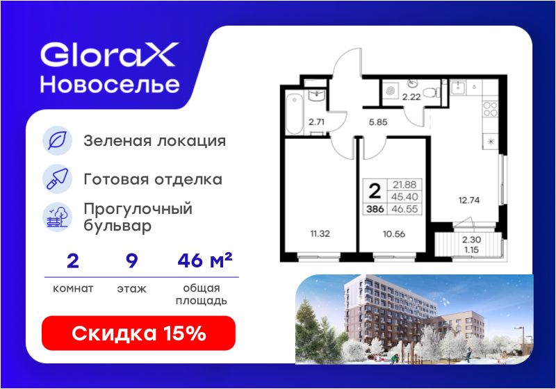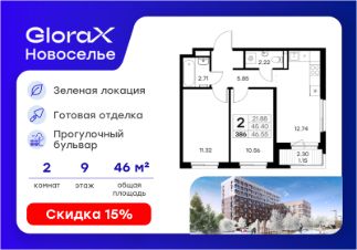 Продается 2-комн. квартира на 9-м этаже в строящемся проекте комфорт-класса GloraX Новоселье. Общая площадь лота составляет 46,55 кв. м, из которых 21,88 кв. м отведено под жилую и 12,74 кв. м под кухонную зону. Номер квартиры - 386