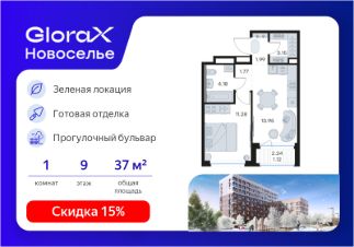 Продается 1-комн. квартира на 9-м этаже в строящемся проекте комфорт-класса GloraX Новоселье. Общая площадь лота составляет 37,44 кв. м, из которых 11,28 кв. м отведено под жилую и 13,95 кв. м под кухонную зону. Номер квартиры - 519