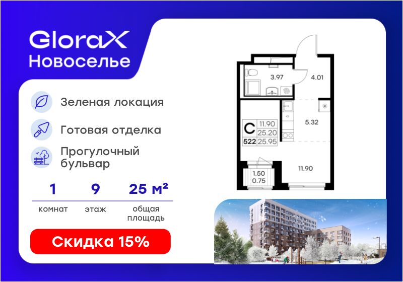 Продается квартира-студия на 9-м этаже в строящемся проекте комфорт-класса GloraX Новоселье. Общая площадь лота составляет 25,95 кв. м, из которых 11,90 кв. м отведено под жилую и 5,32 кв. м под кухонную зону. Номер квартиры - 522