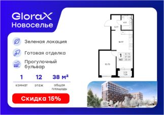 Продается 1-комн. квартира на 12-м этаже в строящемся проекте комфорт-класса GloraX Новоселье. Общая площадь лота составляет 38,64 кв. м, из которых 10,73 кв. м отведено под жилую и 18,97 кв. м под кухонную зону. Номер квартиры - 160