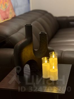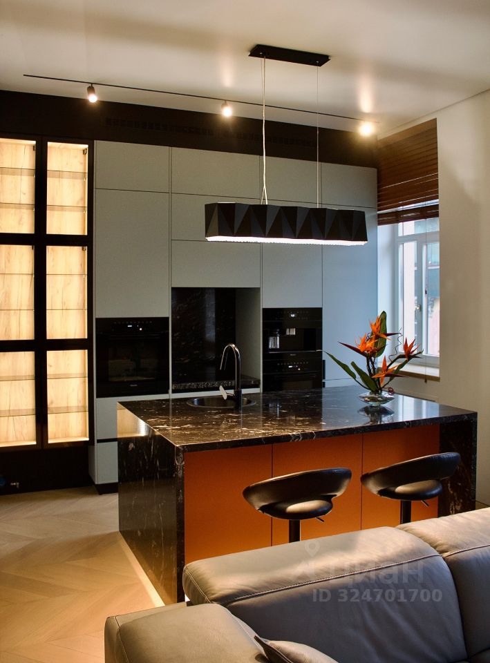 Кухня-гостиная 40.6 м²: Пространство для приема гостей с камином и островом из натурального камня и мягкой мебелью знаменитой итальянской фабрики Natuzzi. Вся кухонная техника — премиального бренда Miele (посудомоечная машина, духовой шкаф, варочная панель, микроволновая печь и кофемашина). Дополняют картину встроенный винный шкаф и робот-пылесос с системой самоочистки. Для киновечеров установлена современная проекторная система с экраном.