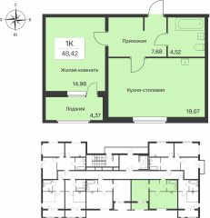 Продаётся 1-комнатная квартира в сданном доме (Корпус 4), срок сдачи: IV-кв. 2024, общей площадью 48.1 кв.м., на 7 этаже. Описание проекта: