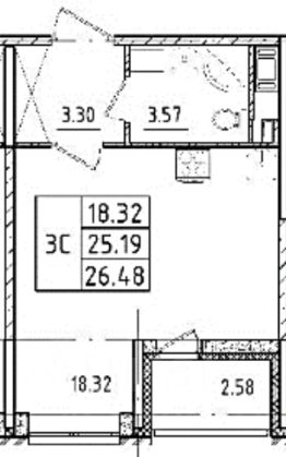 Общей площадью 25.19. + остекленная лоджия 2.58 кв.м.