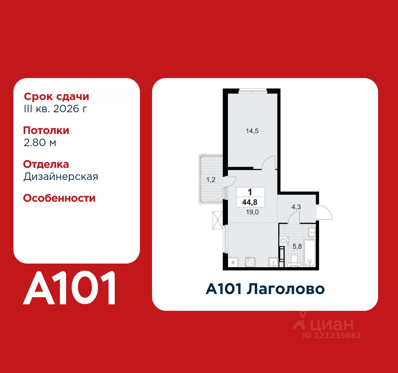1-комнатная квартира площадью 44.80 в ЖК "А101 Лаголово" c балконом на 4 этаже. Квартира с отделкой. Вид из окна на улицу. В квартире 1 санузел. Высота потолков 2.8 м.