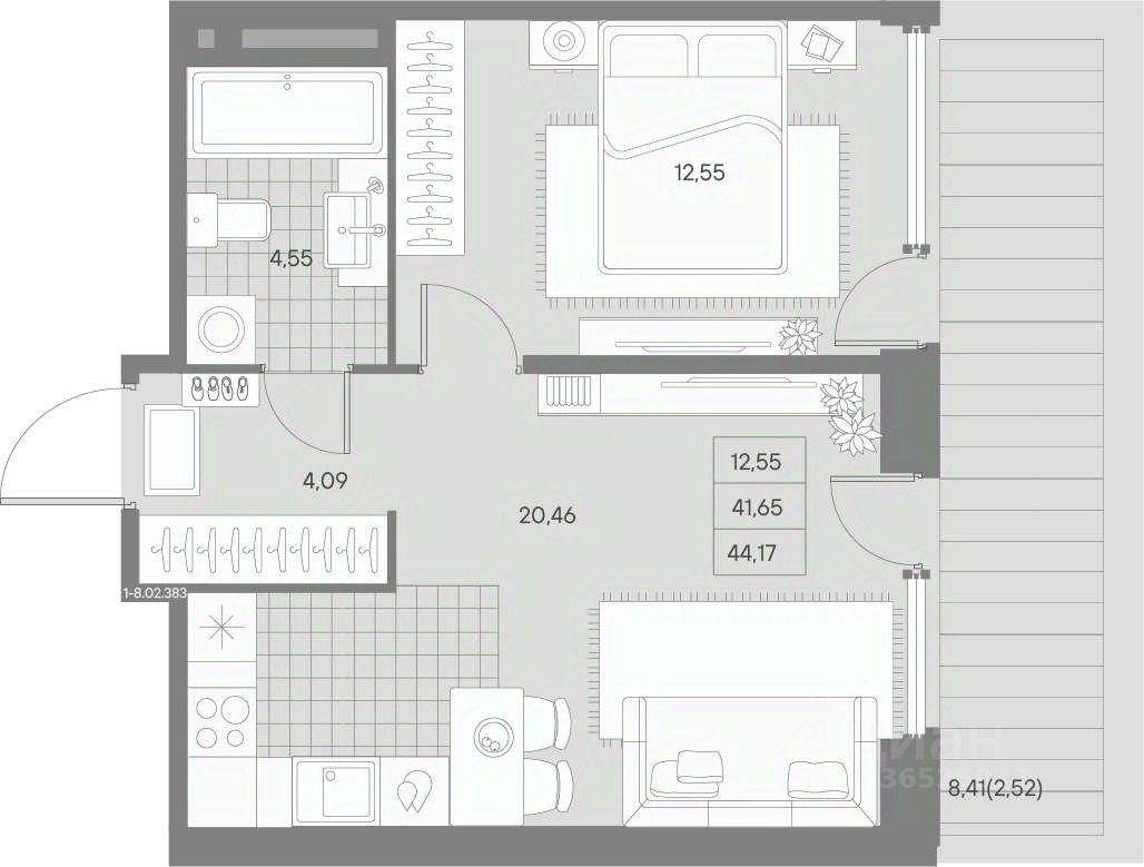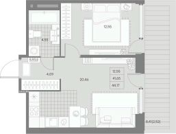 Жилая площадь 12.55 м2, кухня 20.46 м2, черновая отделка.