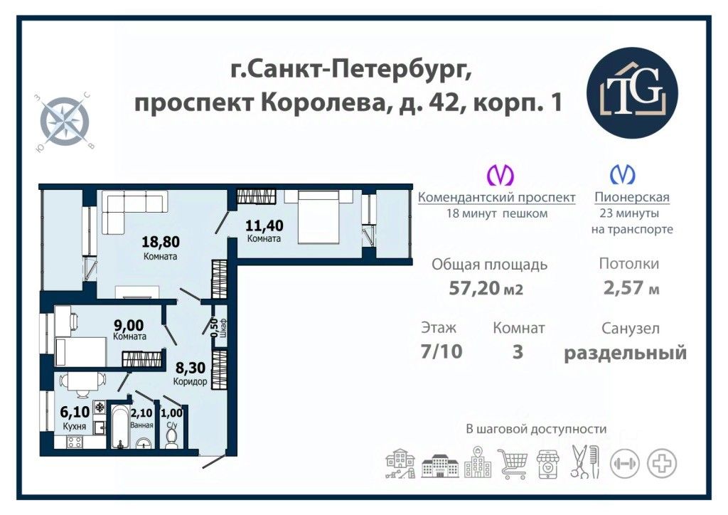 До метро Комендантский проспект 18 минут пешком, а также удобный выезд на КАД и на ЗСД.