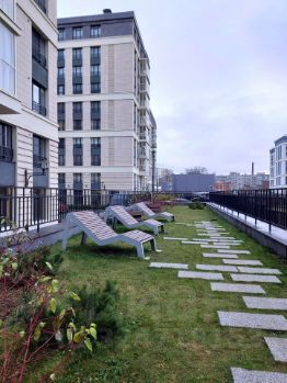 Комплекс имеет благоустроенную территорию с ландшафтным дизайном, множеством зеленых насаждений и клумб. Территория закрыта от машин, есть консьерж и видеонаблюдение. Во дворе реализована прекрасная зона отдыха для жителей: лежаки, качели, настольный теннис, детские площадки. Колясочные в каждой парадной. У конкретно этого дома имеется своя наземная парковка за автоматическими воротами.