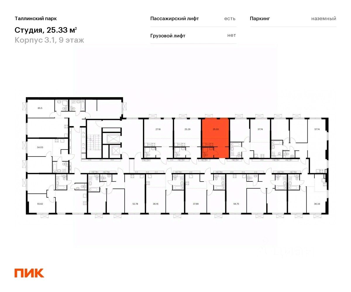 Продаётся квартира-студия площадью 25 кв.м на 9 этаже 12 этажного дома (Корпус 3.1, Секция 1) проекта ПИК Таллинский парк. Светлый просторный подъезд на уровне земли, функциональная планировка, большие окна, предчистовая отделка.
