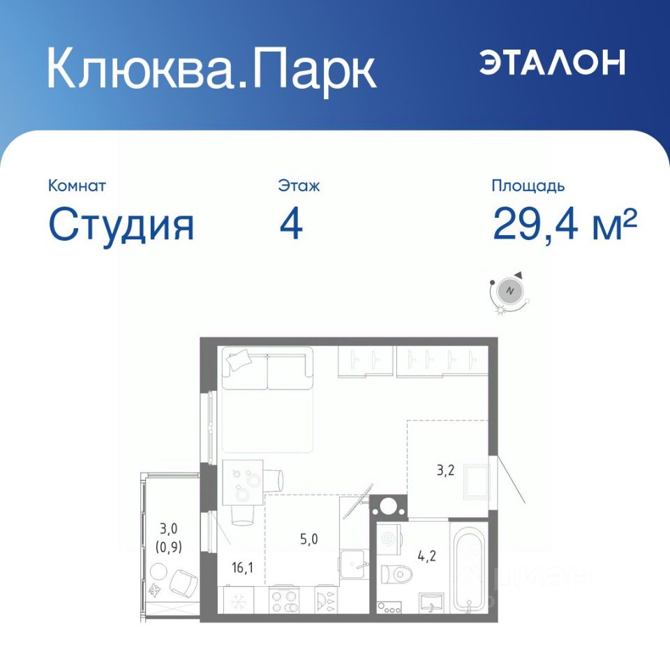 Общая площадь квартиры — 29.4 кв. м, этаж 4 из 12.