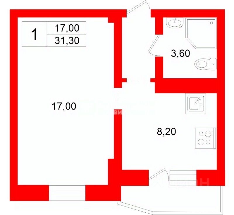 Квартира правильной планировки, общая площадь 31,3 кв. м.