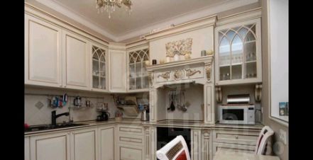 Просторная кухня на заказ из массива дуба с декоративными элементами, покрытыми сусальным золотом.
