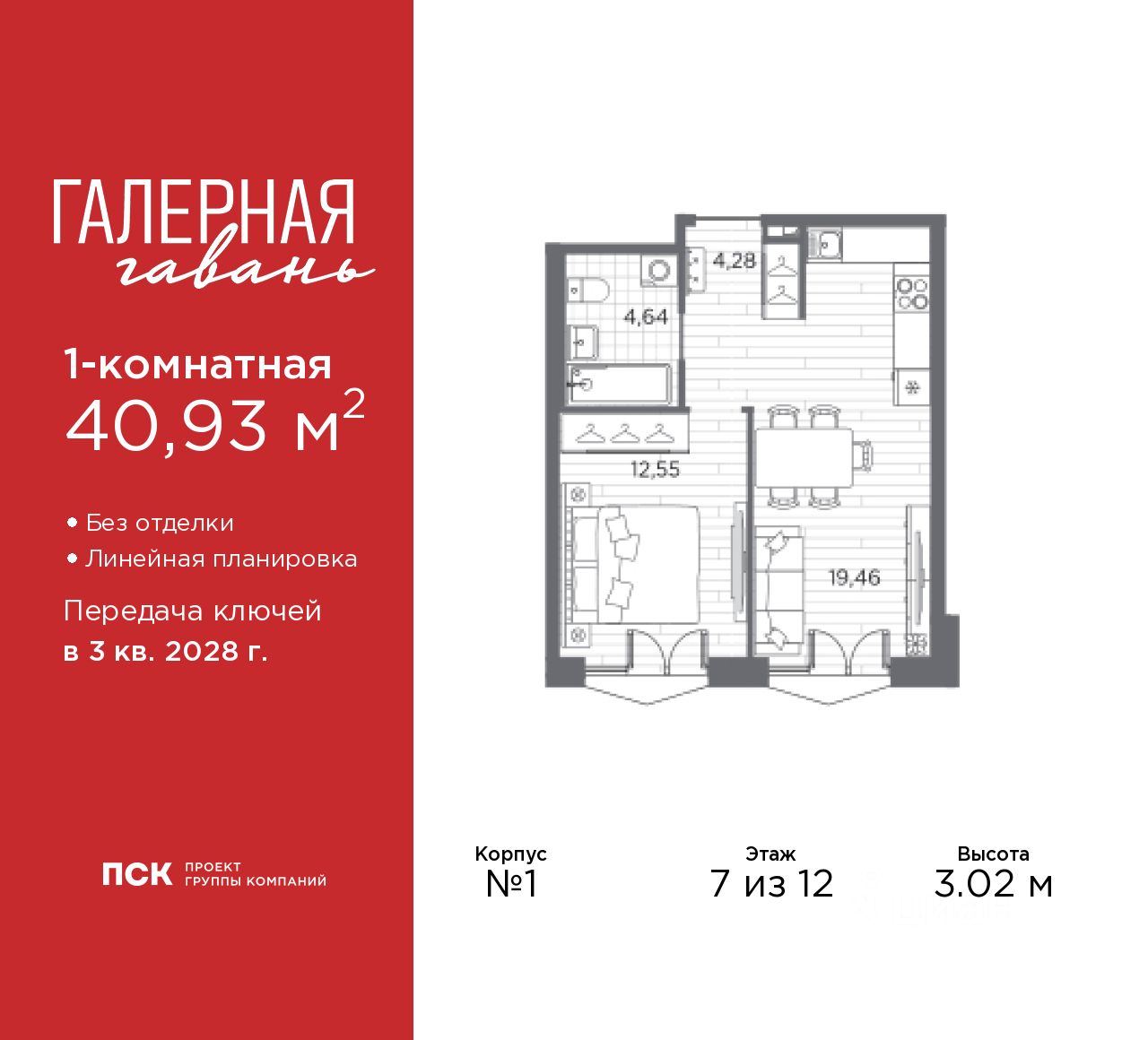 Продается однокомнатная квартира в ЖК "Галерная гавань" на 7 этаже. Квартира без отделки, новый собственник может сделать ремонт по своему проекту. Общая площадь: 40.93 кв.м., жилая: 12.55 кв.м., площадь просторной кухни-столовой: 19.46 кв.м. Все окна выходят на одну сторону. В квартире один совмещенный санузел. Высота потолков 3.02 м.