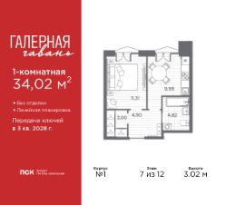 Просторная 1-комн. квартира в ЖК "Галерная гавань" на 7 этаже. Квартира без отделки, новый владелец может сделать ремонт по индивидуальному дизайн-проекту. Общая площадь: 34.02 кв.м., жилая: 11.31 кв.м., площадь просторной кухни-столовой: 9.99 кв.м. Все окна выходят на одну сторону. В квартире один совмещенный санузел. Высота потолков 3.02 м.