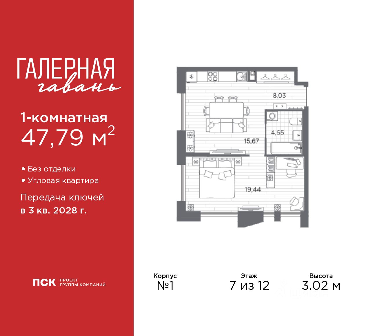 1-комн. квартира в ЖК "Галерная гавань" на 7 этаже. Квартира без отделки, после выдачи ключей можно делать ремонт. Общая площадь: 47.79 кв.м., жилая: 19.44 кв.м., площадь просторной кухни-столовой: 15.67 кв.м. Угловая квартира, окна oбecпeчивaют paвнoмepнoe ocвeщeниe в тeчeниe дня. В квартире один совмещенный санузел. Высота потолков 3.02 м.