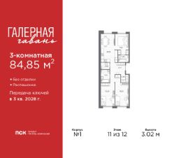 3-комн. квартира от застройщика в ЖК "Галерная гавань" на 11 этаже. Квартира без отделки, после оформления собственности можно делать ремонт. Общая площадь: 84.85 кв.м., жилая: 42.12 кв.м., площадь просторной кухни-столовой: 18.95 кв.м. Квартира - распашонка, без проходных комнат, окна выходят на paзные стороны дома. В квартире два совмещенных и один раздельный санузел. Высота потолков 3.02 м.