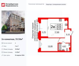 Уникальная, функциональная европланировка, большая кухня-гостиная 17.8 м², просторная прихожая 5.12 м². Общая площадь квартиры - 39.58 м², жилая 12.05 м², высота потолка 3 м.