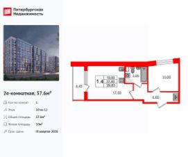 Удобная, классическая, функциональная европланировка, большая кухня-гостиная 17 м², просторная прихожая 6.65 м². Общая площадь квартиры - 37.6 м², жилая 10 м², высота потолка 2.77 м.
