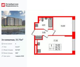 Удобная, классическая, функциональная европланировка, большая кухня-гостиная 17.02 м², вместительная прихожая 3.82 м². Общая площадь квартиры - 35.75 м², жилая 10 м², высота потолка 3 м.