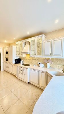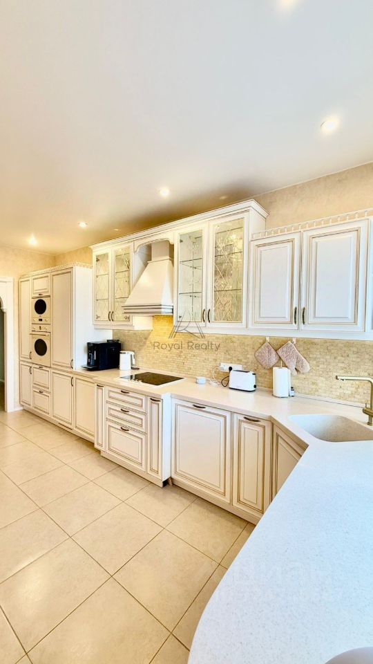 Сердцем дома является просторная кухня-гостиная, оснащенная премиальной техникой Smeg и Liebherr, так же установлен измельчитель пищевых отходов-незаменимая вещь для поддержания чистоты и гигиены. Кухонный гарнитура выполнена из натуральных материалов.