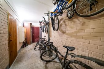 - Квартира расположена на лестничной площадке, которая делится на 2 части между собственниками, что создает дополнительное пространство для хранения велосипедов, детских колясок, самокатов.На площадке также установлена обувница и двустворчатый шкаф для верхней одежды.