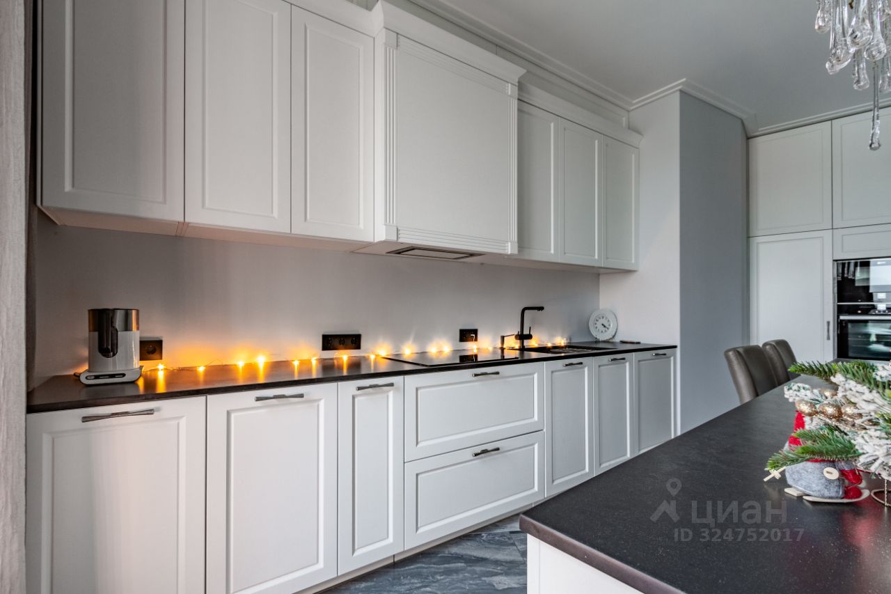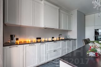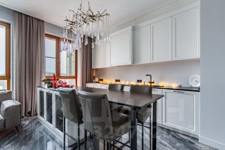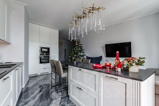 - просторная кухня-гостиная с островом, оборудованная светлой встроенной мебелью и брендовой бытовой техникой