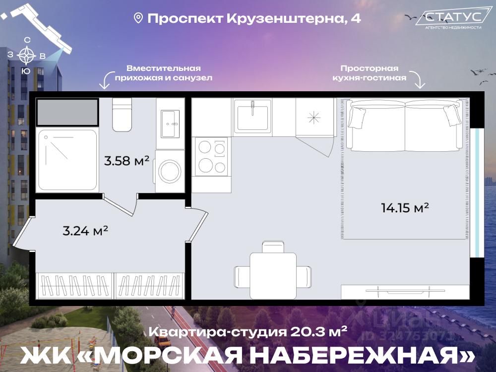 В продаже видовая студия 20,3 кв м на 12/15 этаже в новом жилом комплeксе бизнеc-клacca Mорскaя набеpeжнaя.