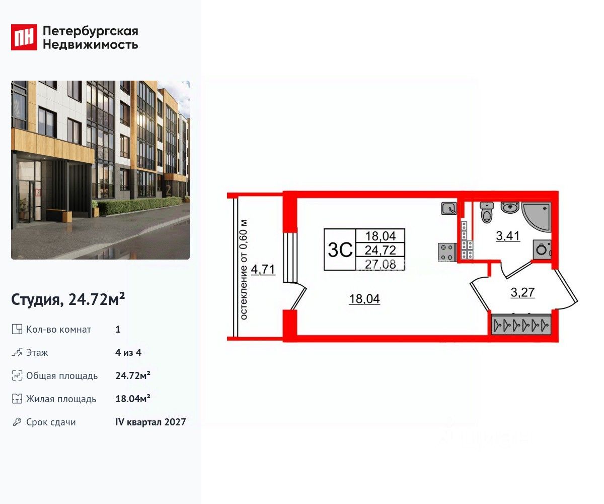 Удобная, классическая, функциональная европланировка, просторная прихожая 3.27 м². Общая площадь студии - 24.72 м², жилая 18.04 м², высота потолка 3.07 м.