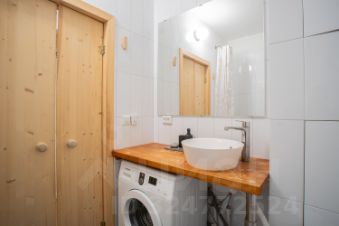 Жилая комната имеет правильные пропорции, удобно выделяются отдельные зоны для отдыха, работы, приготовления пищи. В санузле благодаря разумной планировке помещается полноценная ванна, стиральная машина спрятана под деревянной столешницей. В коридоре и на лоджии оборудовано компактное хранение.
