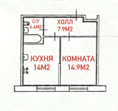 Площадь: 41.2 м² (комната 14,9 м², кухня 14 м², холл 7.9 м², с/у 4,4 м²).