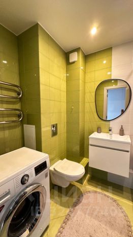 Ванна оборудована новой качественной сантехникой: унитаз с подвесной инсталляцией, подвесная тумба с раковиной, ванна с душевой системой. Стиральная машина LG с прямым приводом обеспечивает тихую стирку.