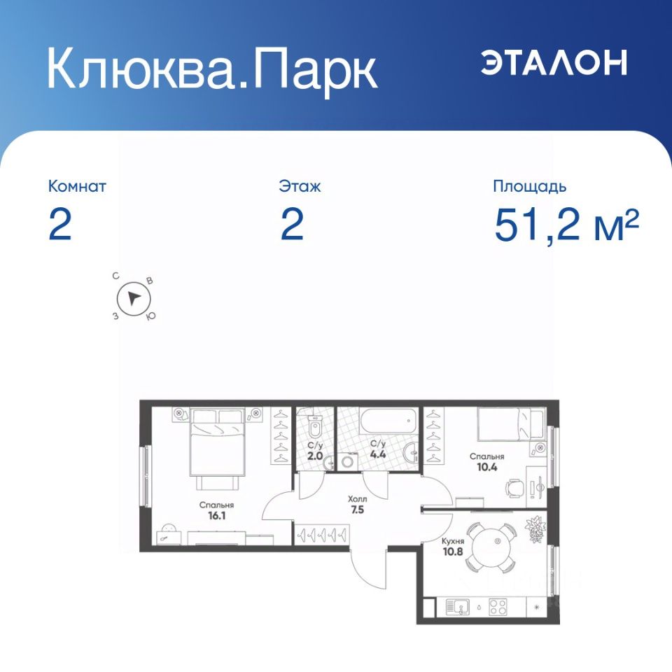 Общая площадь квартиры — 51.2 кв. м, этаж 2 из 12.