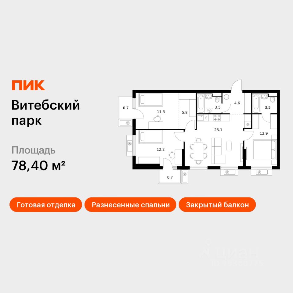 Продаётся 3-комн. квартира площадью 78,4 кв.м на 4 этаже 12 этажного дома (Корпус 7, Секция 4) проекта ПИК Витебский парк. Светлый просторный подъезд на уровне земли, функциональная планировка, большие окна, c отделкой.