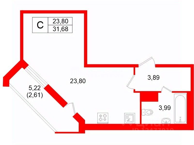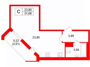 О квартире: просторная студия интересной планировки с черновой отделкой, комната 23,8 м.