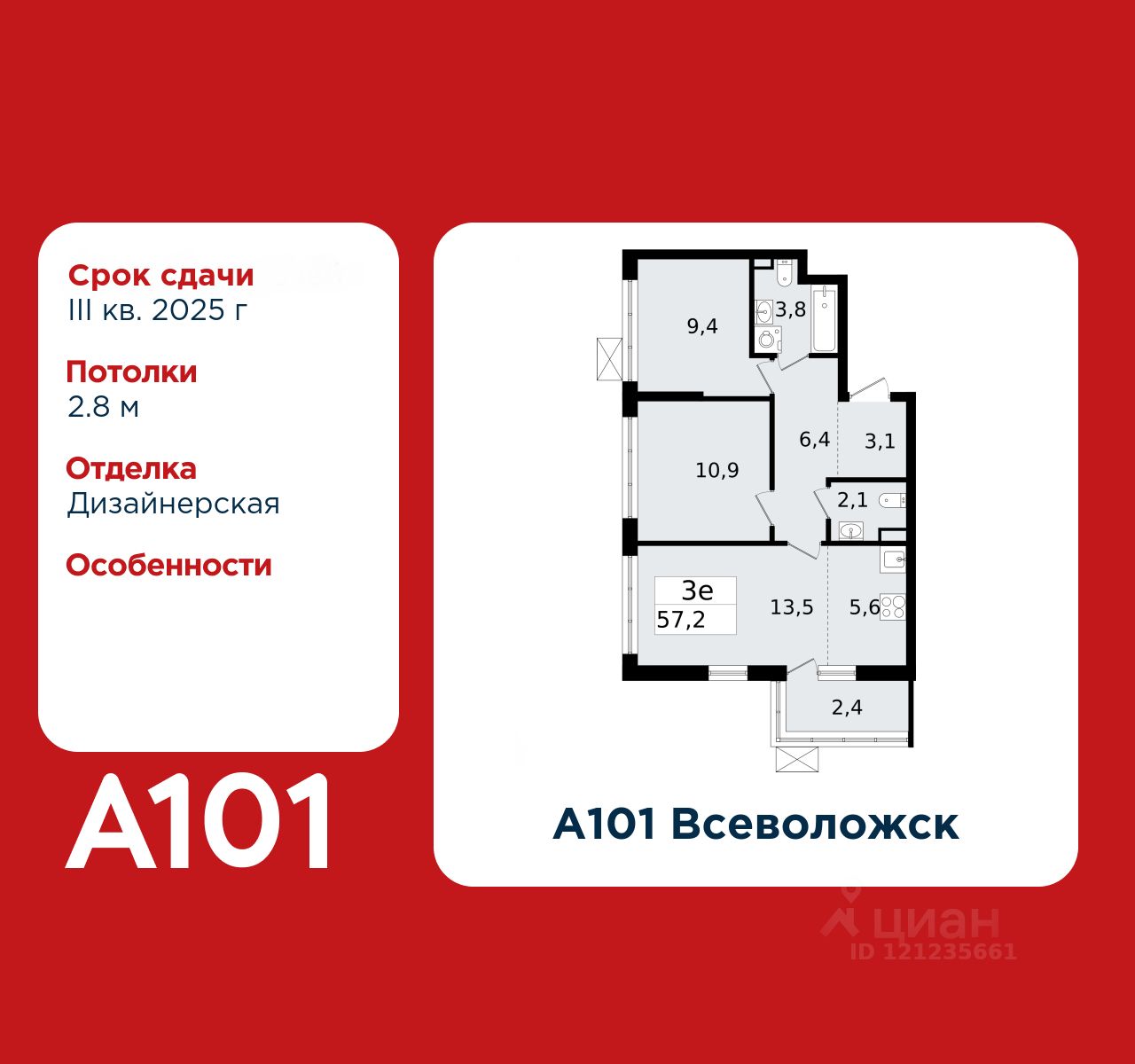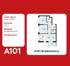 1-комнатная квартира площадью 56.40 в ЖК "А101 Всеволожск" на 8 этаже. Квартира с отделкой. Вид из окна на улицу. Высота потолков 2.8 м.