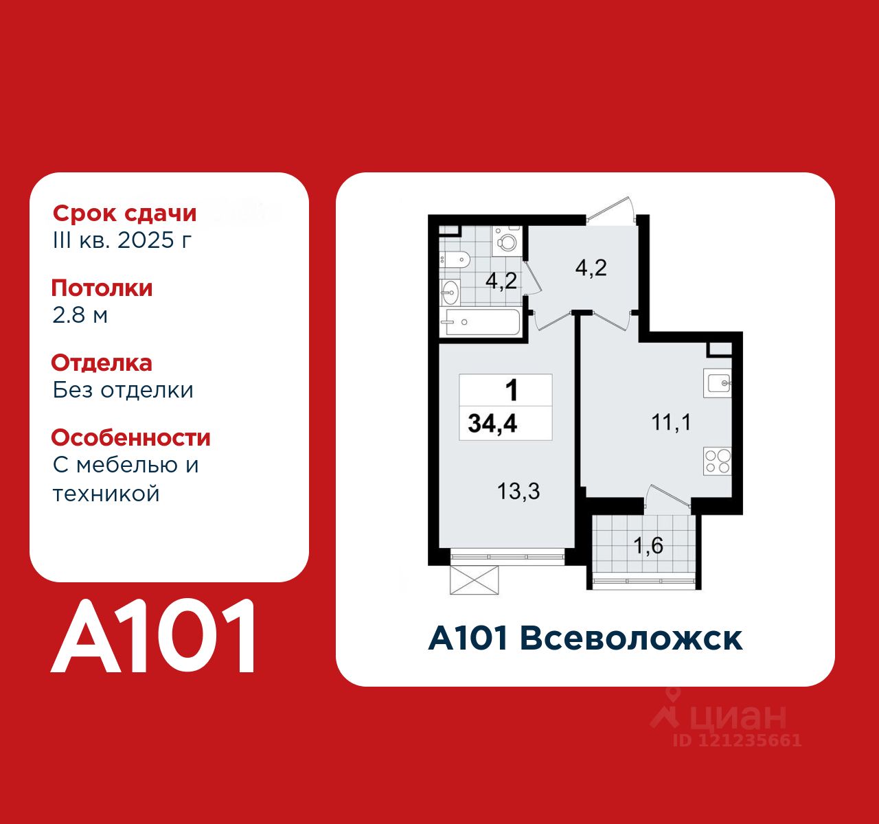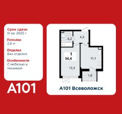1-комнатная квартира площадью 34.40 в ЖК "А101 Всеволожск" c лоджией на 3 этаже. Квартира без отделки. Вид из окна на улицу. В квартире 1 санузел. Высота потолков 2.8 м.