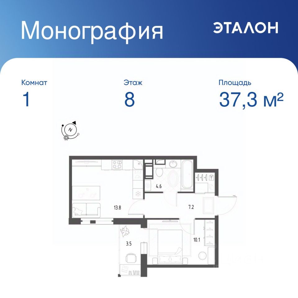 Общая площадь квартиры — 37.3 кв. м, этаж 8 из 12.