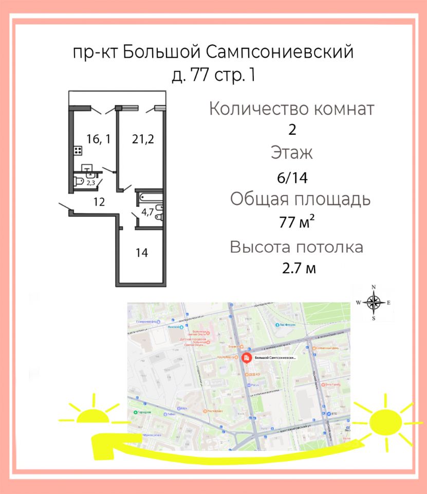• Комнаты: 21,2 м² и 14 м²