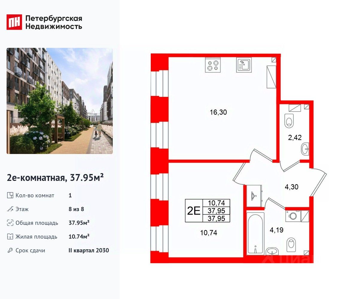 Удобная, классическая, функциональная европланировка, большая кухня-гостиная 16.3 м², вместительная прихожая 4.3 м². Общая площадь квартиры - 37.95 м², жилая 10.74 м², высота потолка 2.72 м.