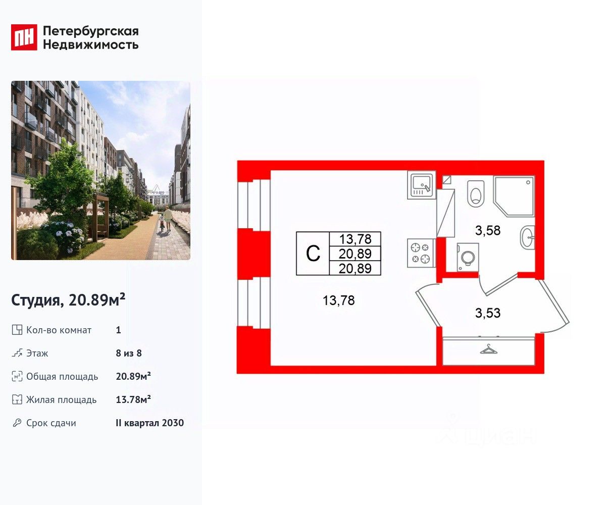 Удобная, классическая, функциональная европланировка, просторная прихожая 3.53 м². Общая площадь студии - 20.89 м², жилая 13.78 м², высота потолка 2.72 м.