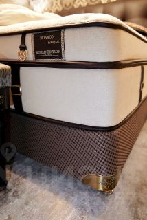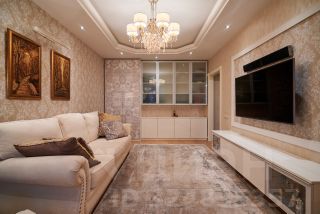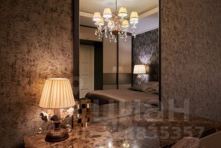 Спальня со встроенными системами хранения, роскошной кроватью KING KOIL, светильниками и люстрами из премиальной линейки Masiero. Банкетка и стул обтянуты натуральным шёлком, столешница туалетного столика выполнена из мрамора.