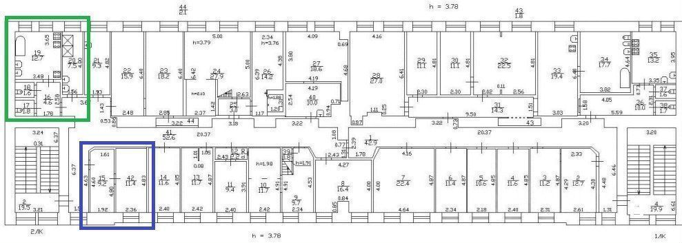 места общего пользования совсем рядом с комнатами (на плане выделены - зеленым цветом);