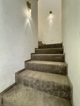 Лестница покрыта ковровым изделием,а стеклянное ограждение сделано из закаленного стела по индивидуальному заказу.