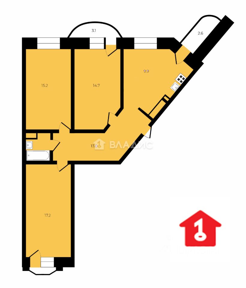 Три изолированные комнаты (17,2 + 15,2 + 14,7 кв. м) идеально подойдут для семьи, желающей иметь личное пространство для каждого члена. Жилая площадь составляет 47,1 кв. м, а кухня — 9,9 кв. м, что достаточно для комфортного размещения и приготовления пищи.
