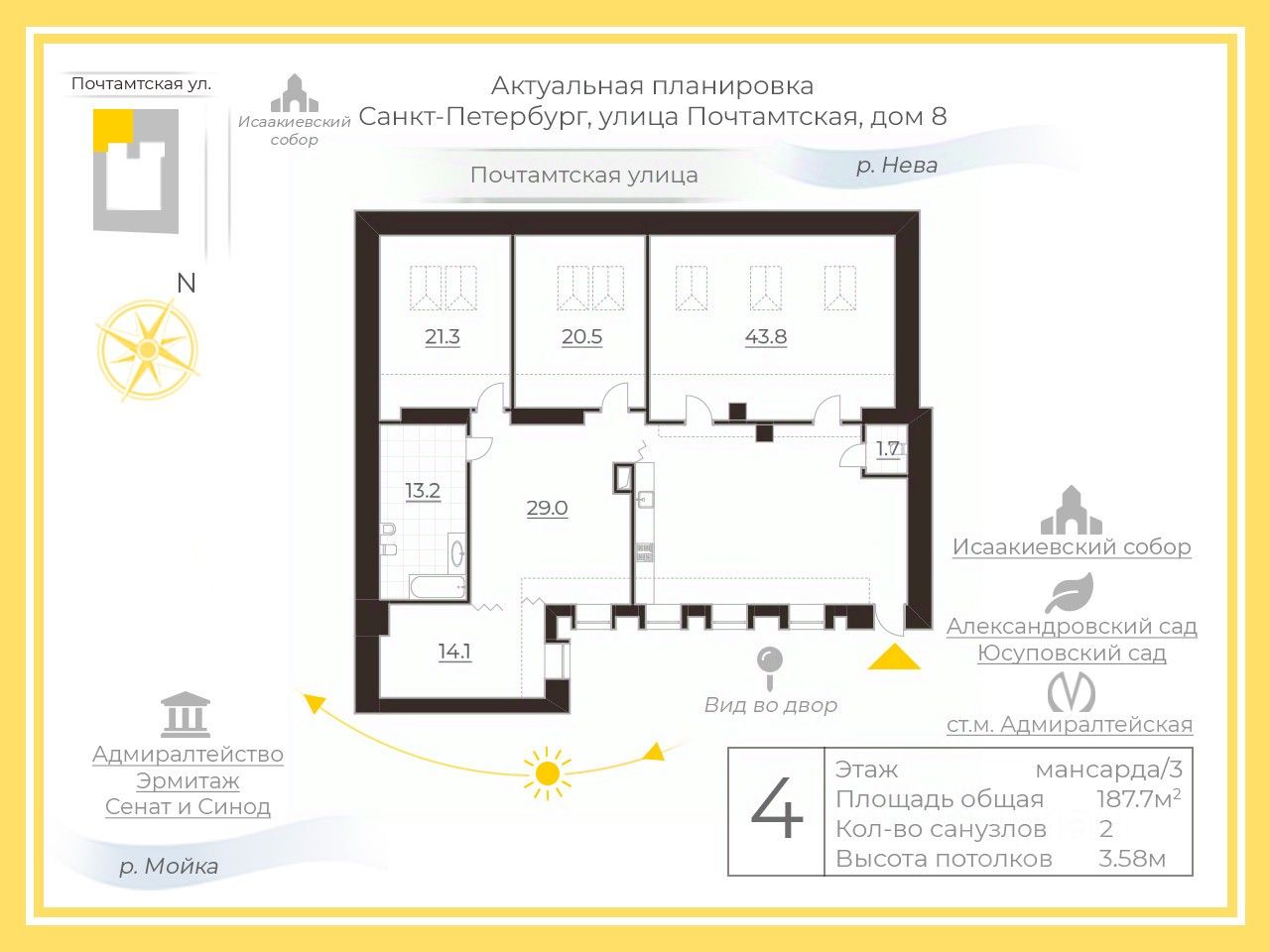 Представляем к приватной продаже исключительный лот — мансардную квартиру-ателье площадью 187 м² в самом сердце имперского Петербурга. Это не просто жилое пространство; это шанс обрести фамильное гнездо в историческом доме К.Н. Корфа (1831 г., арх. Е.Т. Цолликофер) на Почтамтской улице, 8.
