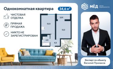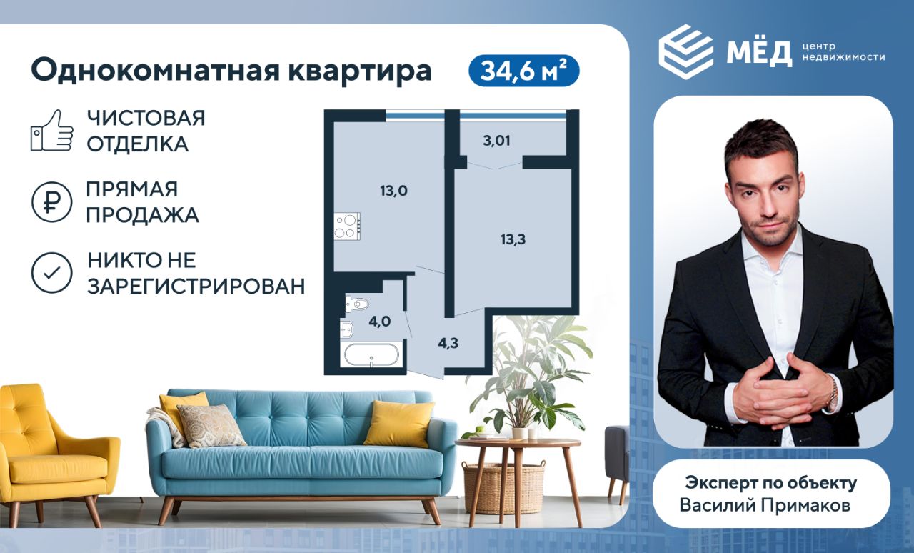 - Общая площадь - 34,6 кв.м без учета лоджии