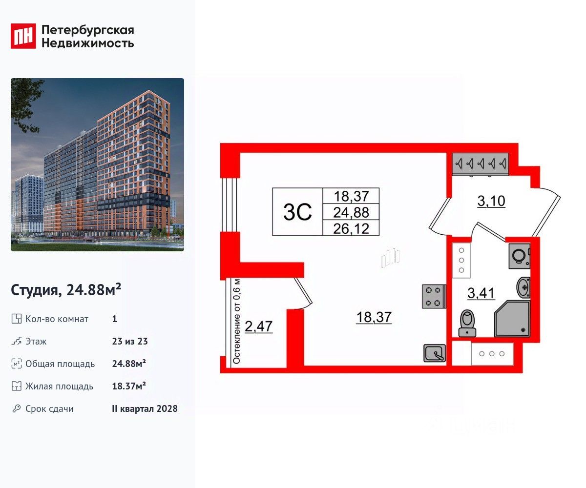 Удобная, классическая, функциональная европланировка, вместительная прихожая 3.1 м². Общая площадь студии - 24.88 м², жилая 18.37 м², высота потолка 3 м.