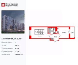 Удобная, классическая планировка, кухня 10.8 м², просторная прихожая 4.53 м². Общая площадь квартиры - 36.32 м², жилая 17.13 м², высота потолка 2.77 м.