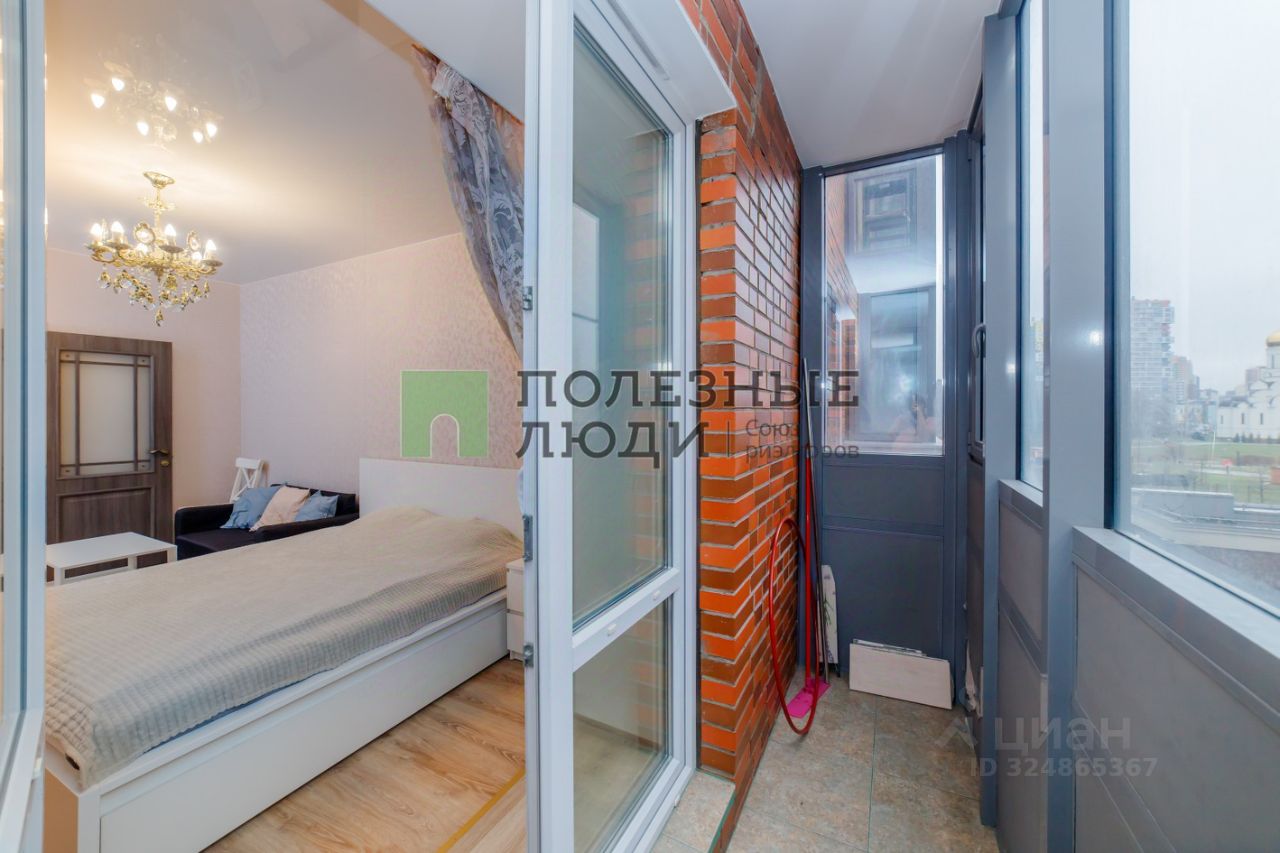 Стоит полноценная двуспальная кровать, диван, столик, комод, ТВ. Есть выход на лоджию с окнами в пол.